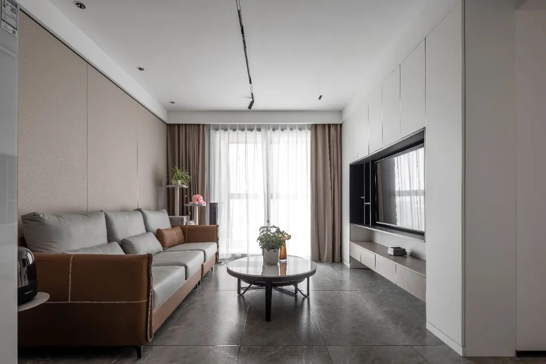 设计师采用了现代装修的一些例如无主灯设计、房门到顶、极窄踢脚线等极简风格元素,增强收纳和实用性。