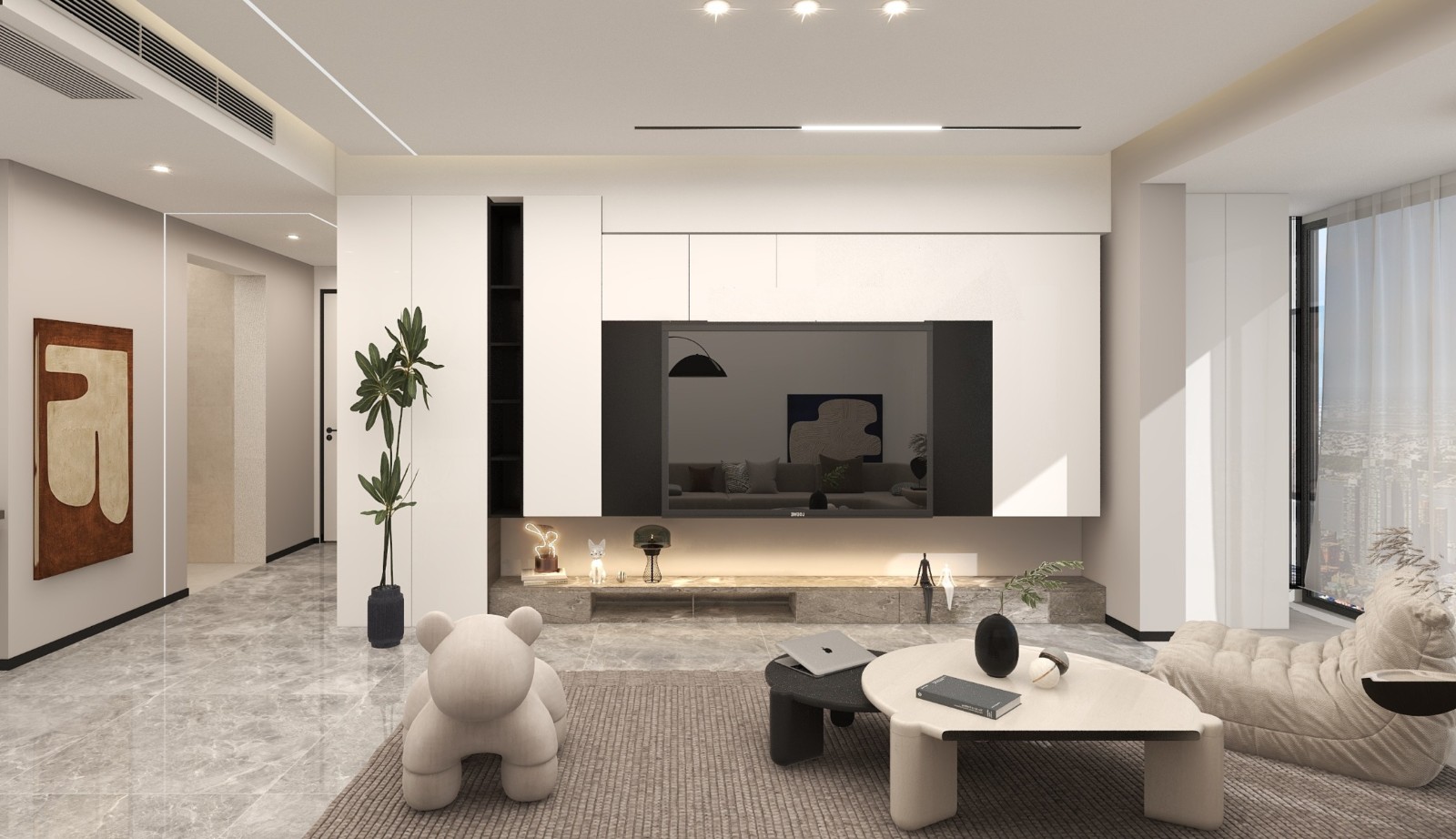 增加点展示柜和储物功能,方便使用 空间更整体;后期电视柜整体是嵌入式的造型,摒弃了传统电视柜,增添了空间感,在电视柜的下方做了灯带,进行点缀,营造轻盈与悬浮感,进门视角的电视柜也可做玄关装饰;