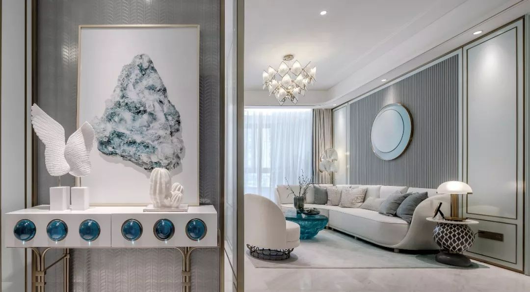 水晶蓝质感的茶几,摆上禅意优雅的摆饰品,使得空间更加晶莹华丽。