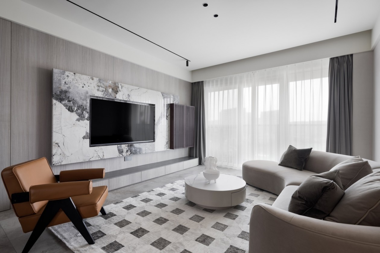 客厅设计主要是从功能和整体空间出发,减少了很多非必要的元素,但它又不是简单的堆砌元素,而是通过创新思维营造的空间氛围。地面铺设的灰色哑光砖配上格纹地毯,时尚中不失家的温度,点缀以一把复古橙色的昌迪加尔椅,增强了空间的视觉丰富性。