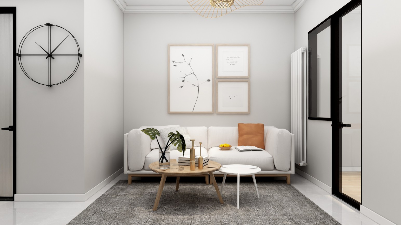 客厅用的是白色为主色调设计,搭配着绿色和橙色。给空间带来生机。