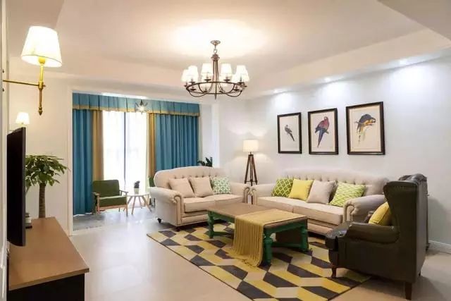 客厅的沙发背景墙是刷成了浅蓝色,搭配鸟类挂画,显得格外的清新。米色的布艺沙发和黑色的皮艺单椅结合矮茶几,体现美式风的感觉。