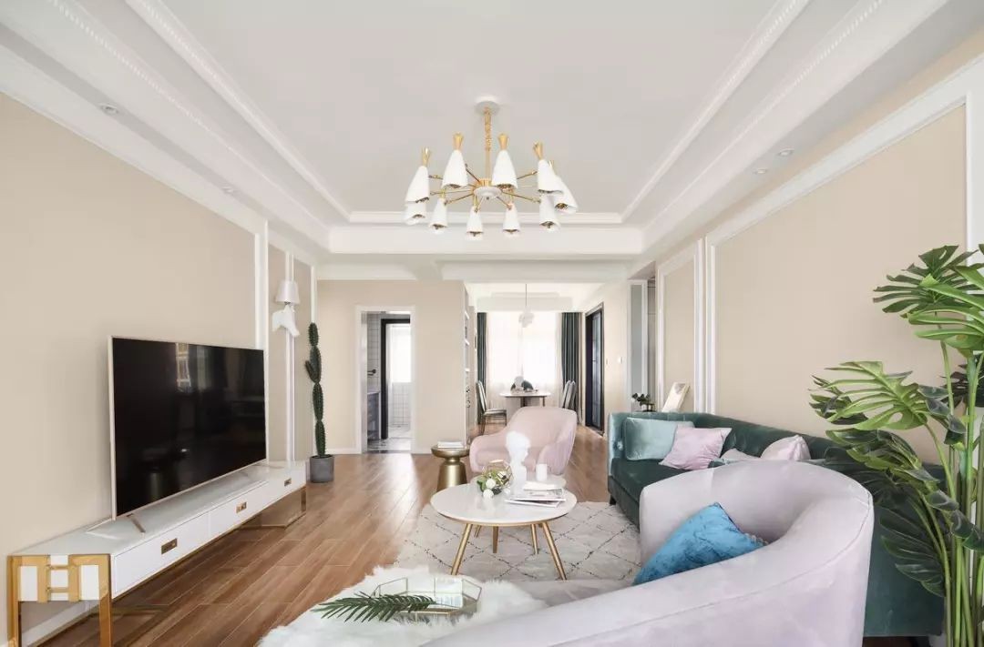 入户玄关走廊过后就是客餐厅的户型,客厅和餐厅分别在房子的两侧,整个空间的墙面都刷成了浅杏色,搭配白色的石膏线作为装饰,温馨而又优雅。