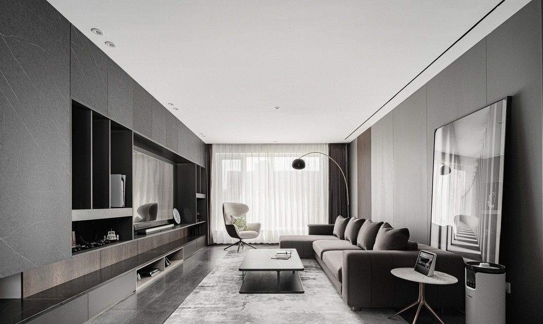 元素单纯化,体量关系简洁化,加之无主灯设计,即使是深色的空间也毫无冗杂之感
