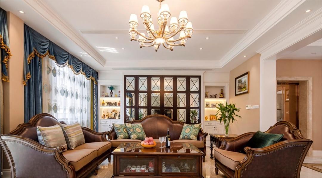 客厅的背景是用用了整面的格子窗造型的镜子,增加空间的径伸感。木质的格子窗也很有美式的感觉。两侧订制了两个立柜,用于收纳。上半部分是半开放式,加上灯带,可以做展览柜。下半部分封闭可以收纳零碎物品。
