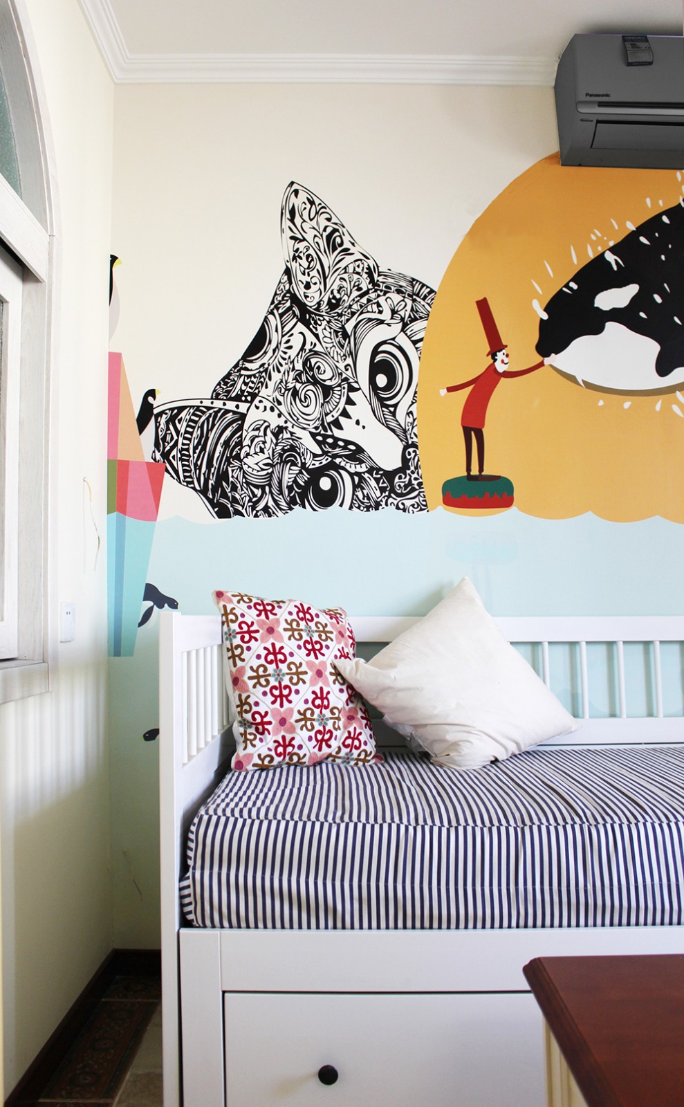 卧室一角,美妙有趣的墙绘搭配清爽自然的床品。