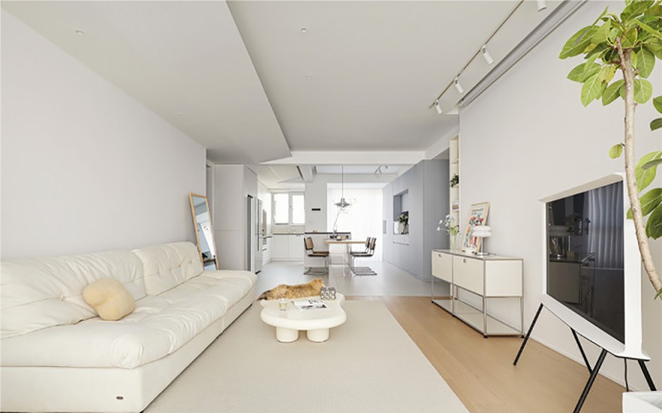 客厅无主灯设计,白色无复杂背景墙让人感觉整个空间简洁舒适,客户追求身心的舒适感,生活中没有那么多条条框框,随性就好。客厅地面选用舒适型原木色地板,与餐厅地砖无缝对接,自然分割。