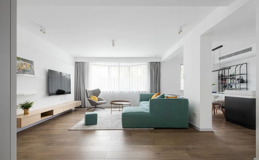 此方案以大白墙+木地板组合设计,打造极简空间