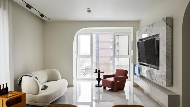空间以现代简约风格为主导,大量使用石材,营造上轻奢质感,用色上,清新奶白色贯穿整屋,家的气质纯净而自然。