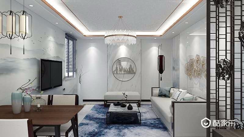 清新的色调搭配中式屏风,用整面墙壁画作为电视背景墙