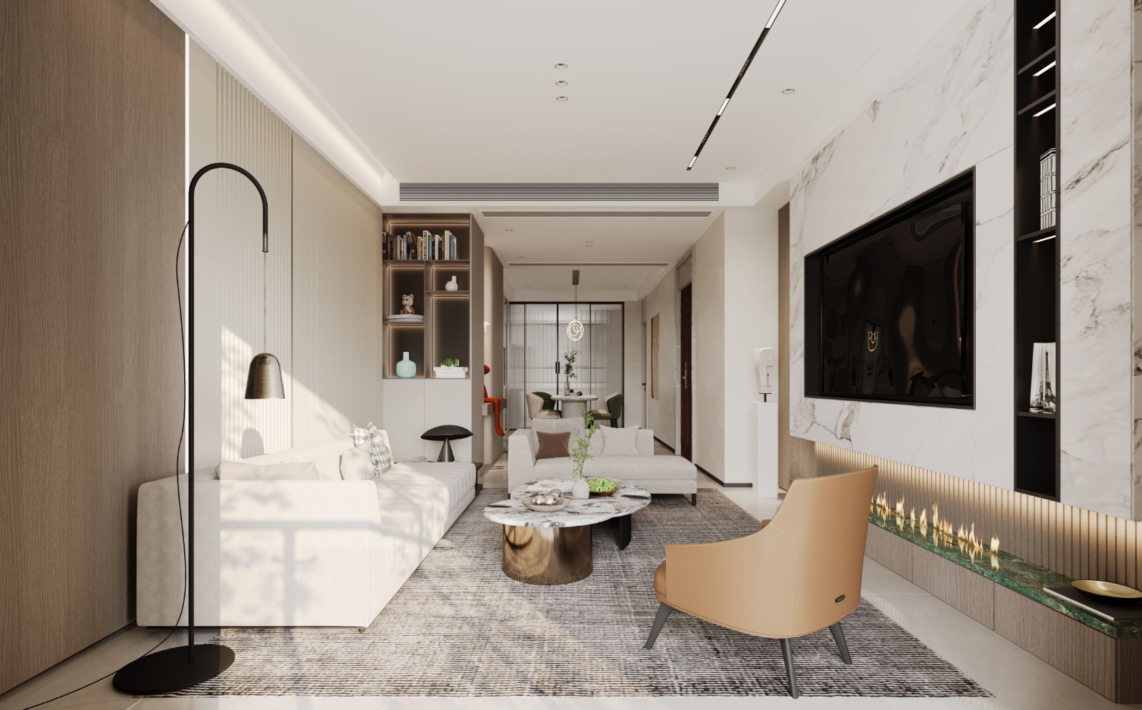 客厅采用无主灯设计,木饰面结合大理石