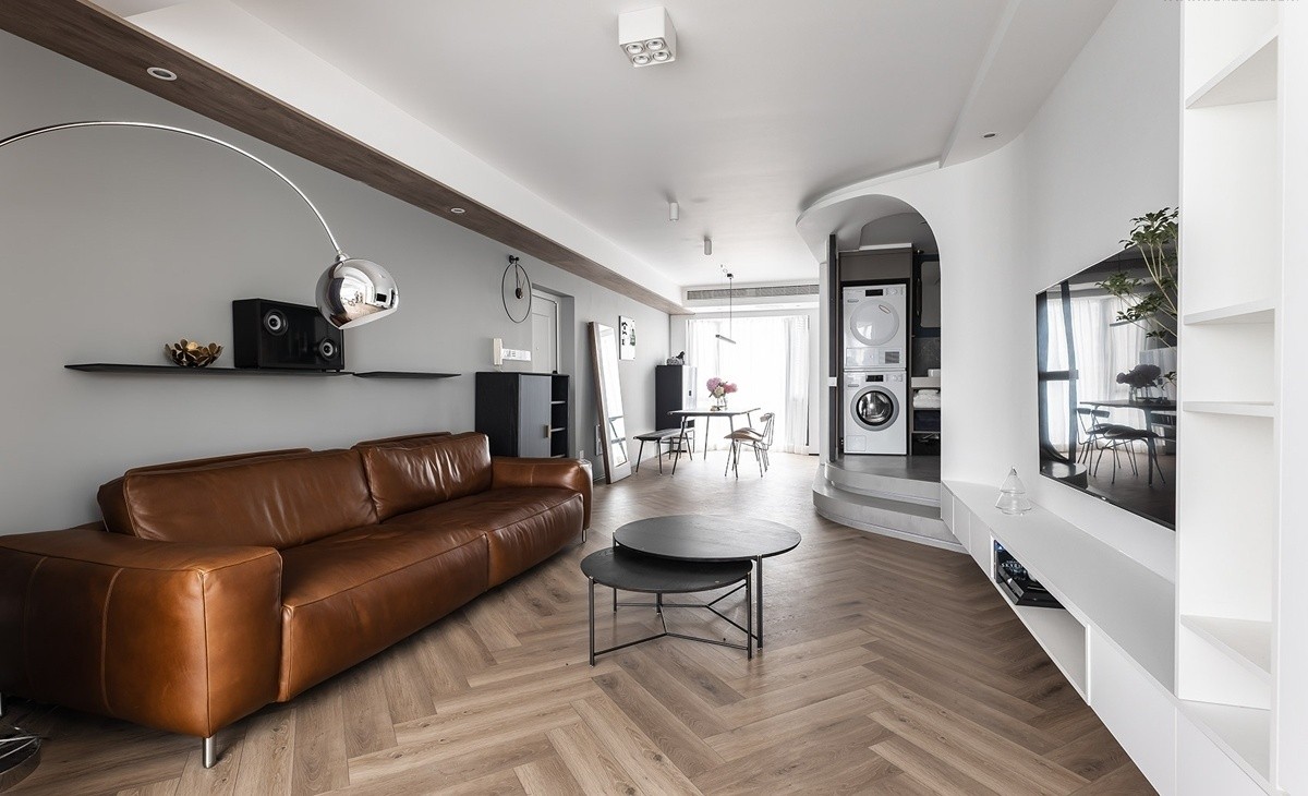 客厅 电视下方做了定制悬浮式矮柜,边缘处的圆弧衔接让墙面和柜体作为一体式衔接,无死角的设计让空间显得更为圆润。房屋整体做了黑色哑光极窄踢脚线,采用极简的理念呼应整屋的写意手法。-瓷砖和地板交界处,采用了金属条收边,统一了上下不平的高度,在防滑安全的同时,增加了美观性。