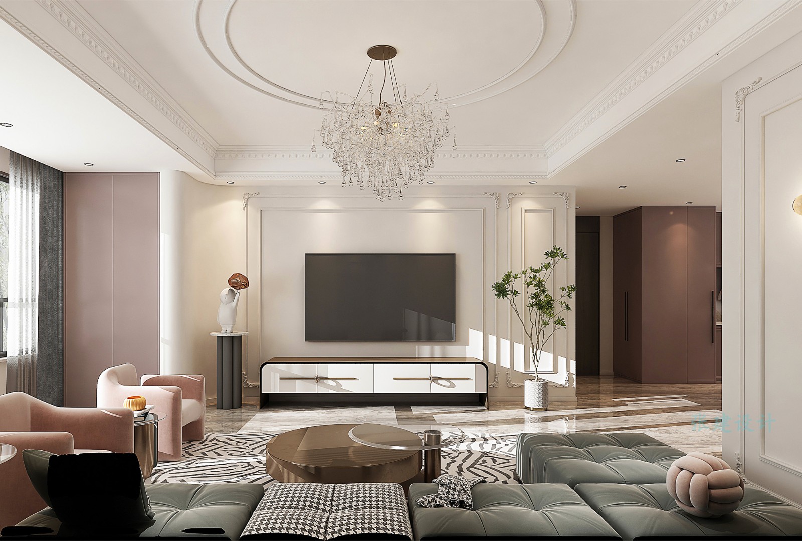 在客厅当中选择乳白色作为空间上主色调,极简的设计风格让整个空间变得十分简约梦幻,流沙金纹路的大理石地面让整个空间变得十分闲奢,金属的茶几摆放又增加整个空间当中的奢华气息。