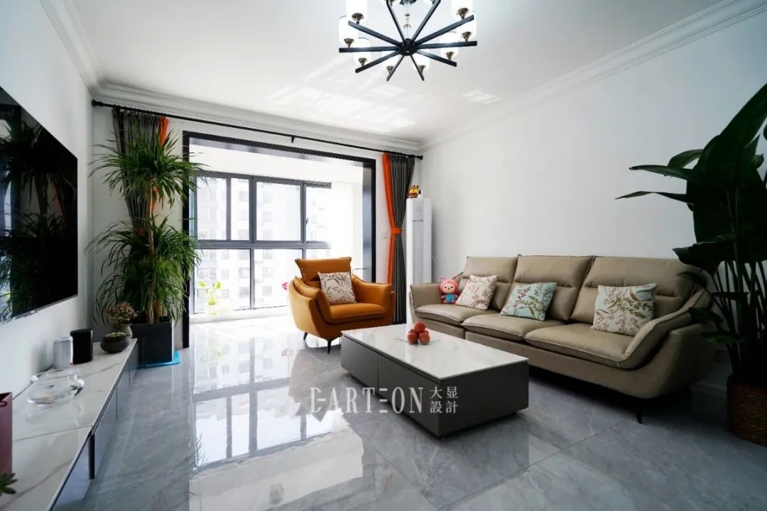 客厅的主沙发也是业主繁忙生活的精神落脚。一套简约的大象灰三人沙发,搭配一把橙色休闲椅做跳色点缀。