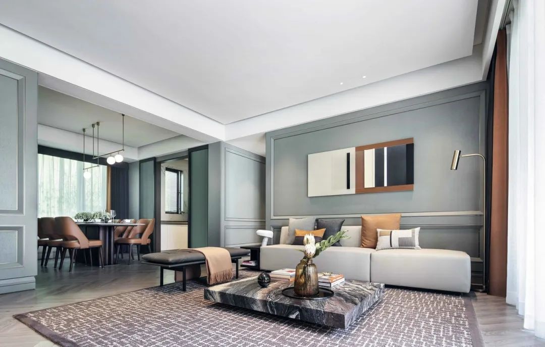沙发墙以蓝灰色为主,加入边框造型,挂上几何造型的装饰画,茶几是石材材质的,茶几上摆着花瓶与杂志,沙发角落位置一盏铜质感的落地灯装饰,整个空间也是充满现代精致的设计质感。