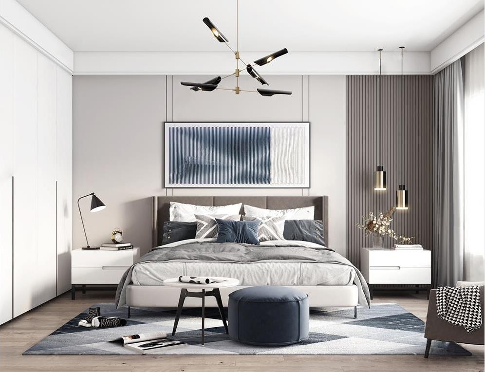 主卧是选用莫兰迪蓝色系搭配白墙,设计偏北欧风,轻奢满满。