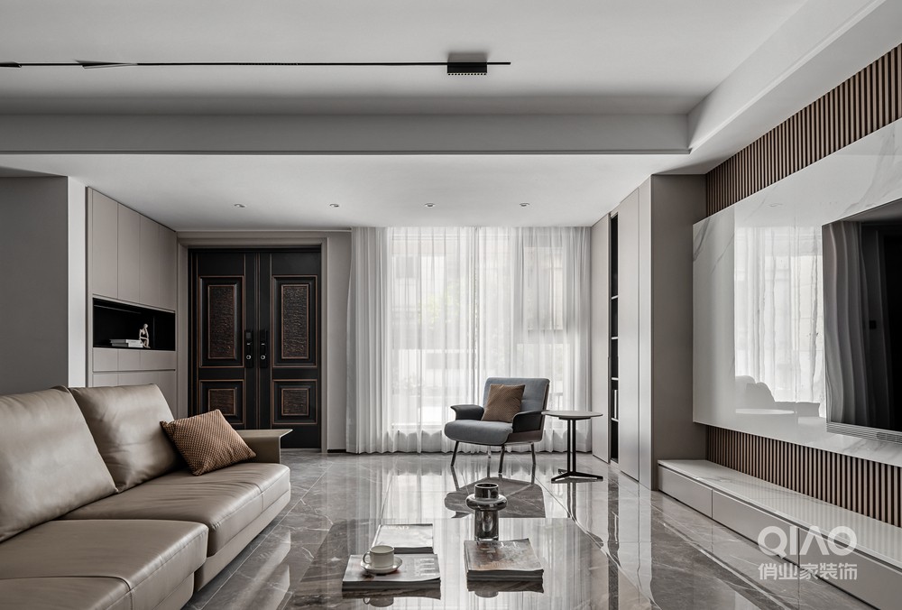 对于柜子、墙板和石材的材质选择、色调搭配,都是基于总体的考量,最终营造出客厅整体统一的现代风格局。