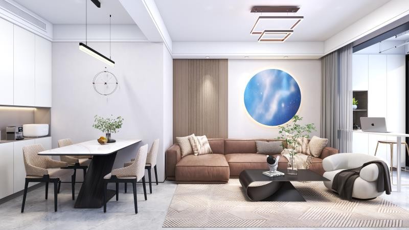 从一进门就一眼看到窗外,会显得整个客厅面积很大,用不同的吊顶灯,和漆面做一个区域划分,客厅背景的圆则是嘉宝莉***地理-阿里星空。
