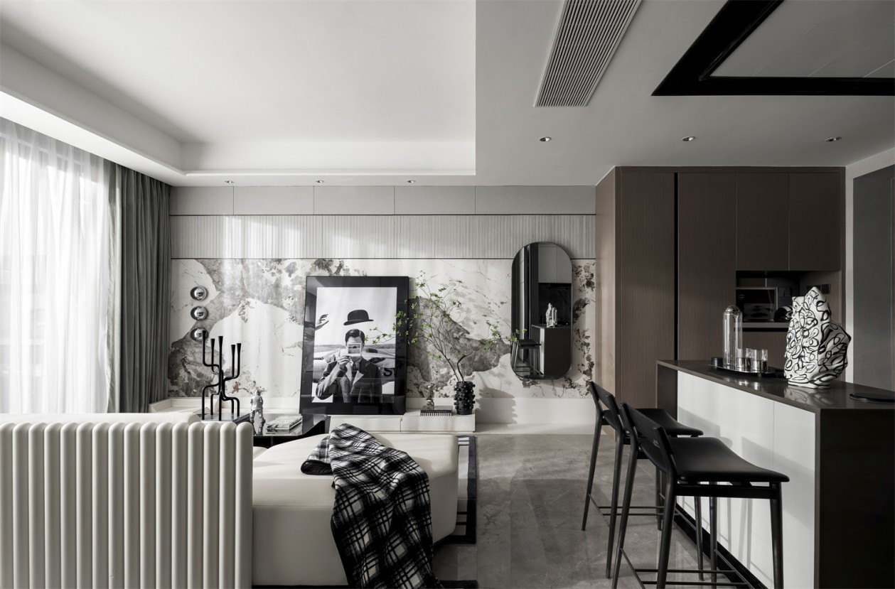 流动的空间气场在这里贯穿始终,主卧室与客厅空间一体化考量,统一的色彩与构成让空间更具整体感韵律和秩序,重复性和连续性为特征的韵律节奏,并在一体化的大基调中营造秩序感,最终涤荡出美的生活方式与场景对话。