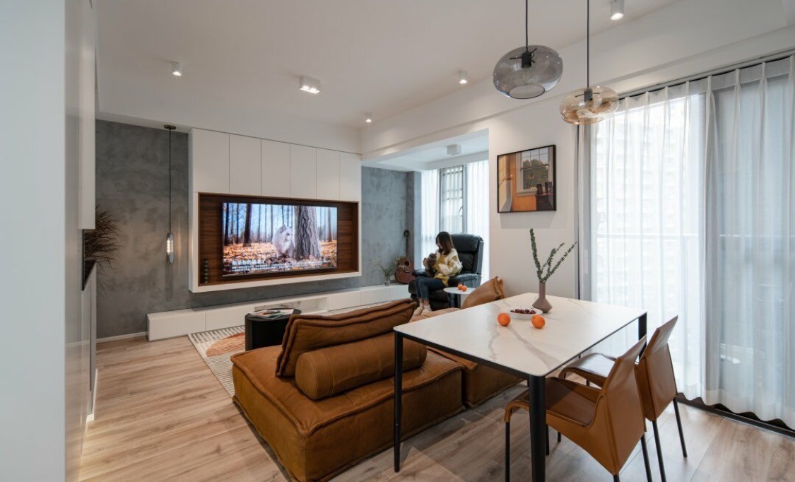全屋无主灯设计,通铺温润木地板,将带有复古质韵的家具配饰,巧妙融入整体空间的灰白构图中,配合挑高窗间洒落的自然光线,共同刻画舒适无压的通透景象。 考虑空间尺度,保证沙发到电视墙视距在2m以内