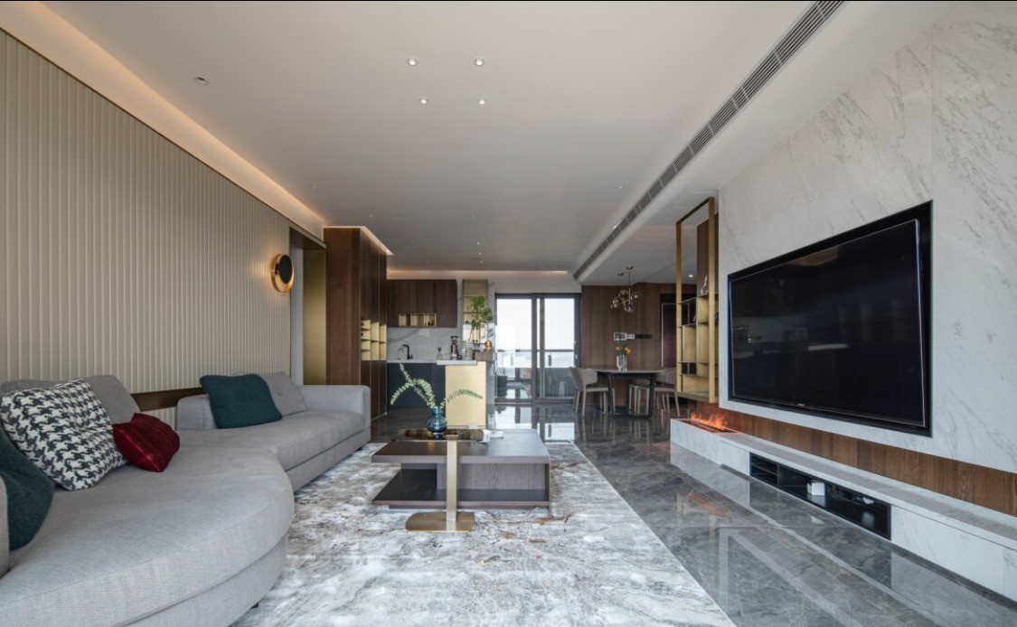 主卫通铺1.2m*0.6m的大板砖,自然大气的灰白纹理交织一起,呈现流动的磅礴气势。胡桃木格栅和钛金边穿插其中,勾勒质感,延续奢华。