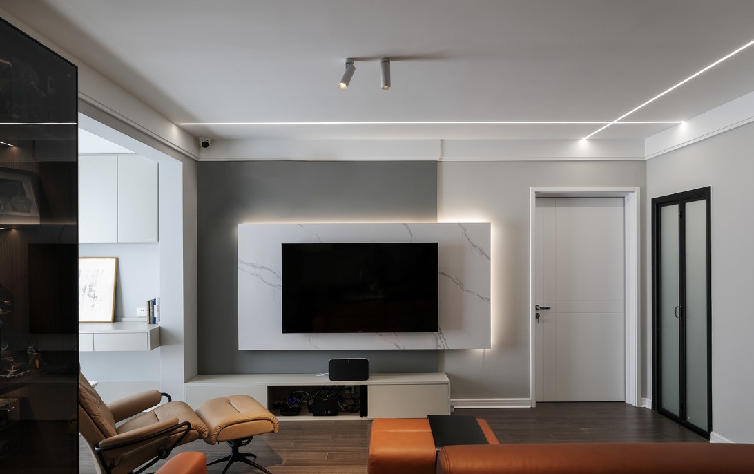 电视背景墙层次分明,低饱和度艺术漆做底,局部拼接深灰色护墙板,同一色调,通过饱和度的变化,制造视觉惊喜。整块的白色大理石叠加到背景墙,形成悬空的视觉效果,客厅整体也更显轻盈.。
