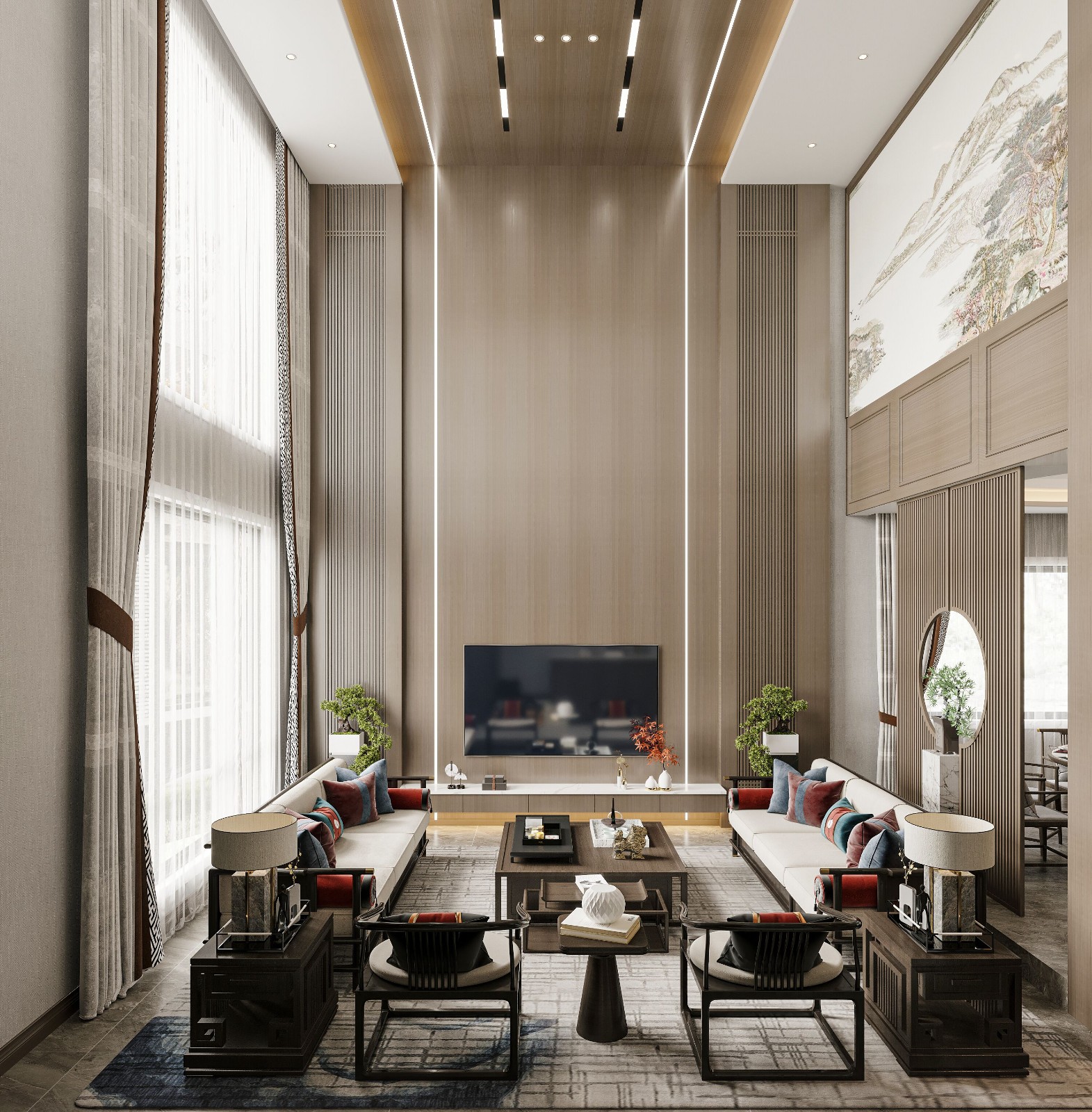 中式风格沉稳精美,线条柔和且以木质为主,匀称而协调,显得非常大气。以沙发椅和茶几为核心,呈现了一种古典奢华的感觉,成功塑造出优雅、端庄的中式魅力。
