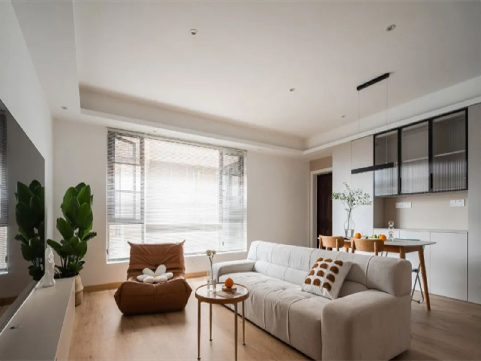 用原木色地板通铺全屋,墙面大面积留白作为底色,整体形成清爽整洁舒适的居住氛围,带来宁静温暖的精神放松