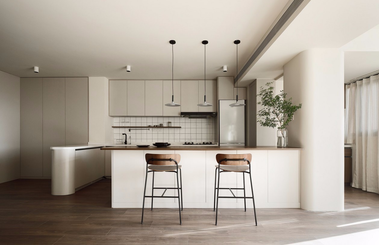 起居室作为房子中重要的活动空间,涵盖了大部分功能,围绕着承重柱体布置了餐厅岛台、沙发区、厨房、咖啡吧等功能区,敞开式厨房与其他功能区连结得更加紧密,让做饭变得没那么孤立、无趣,希望在厨房中与沙发区、咖啡吧之间产生更多生活上的可能性。