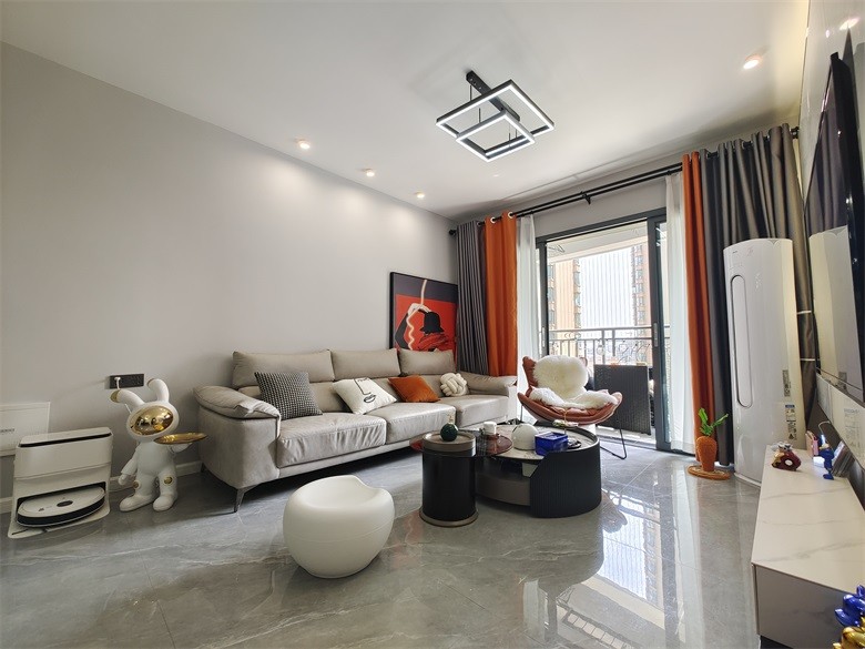 沙发背景墙留白,利用筒灯照射做修饰。沙发后的装饰画与橘色窗帘,成为空间最亮眼的存在,也让整体偏灰调的空间增加活力。