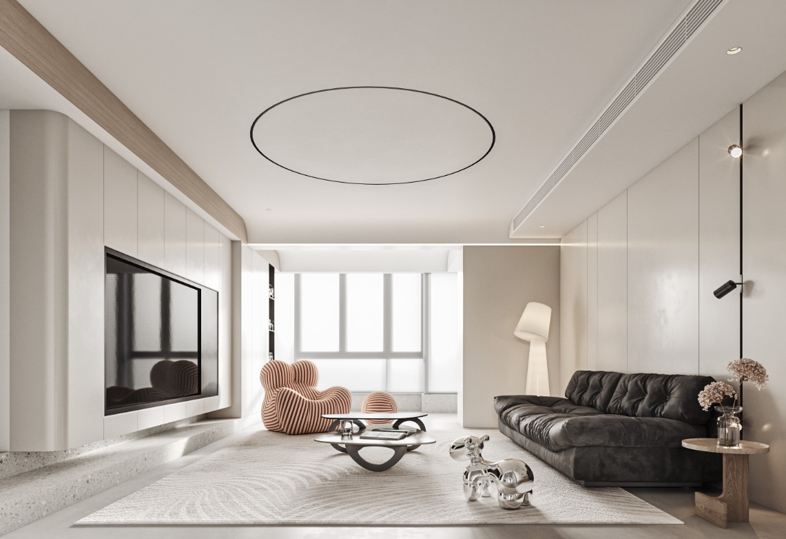 客厅层高较高,采用无主灯吊顶,顶面简单造型做点缀;