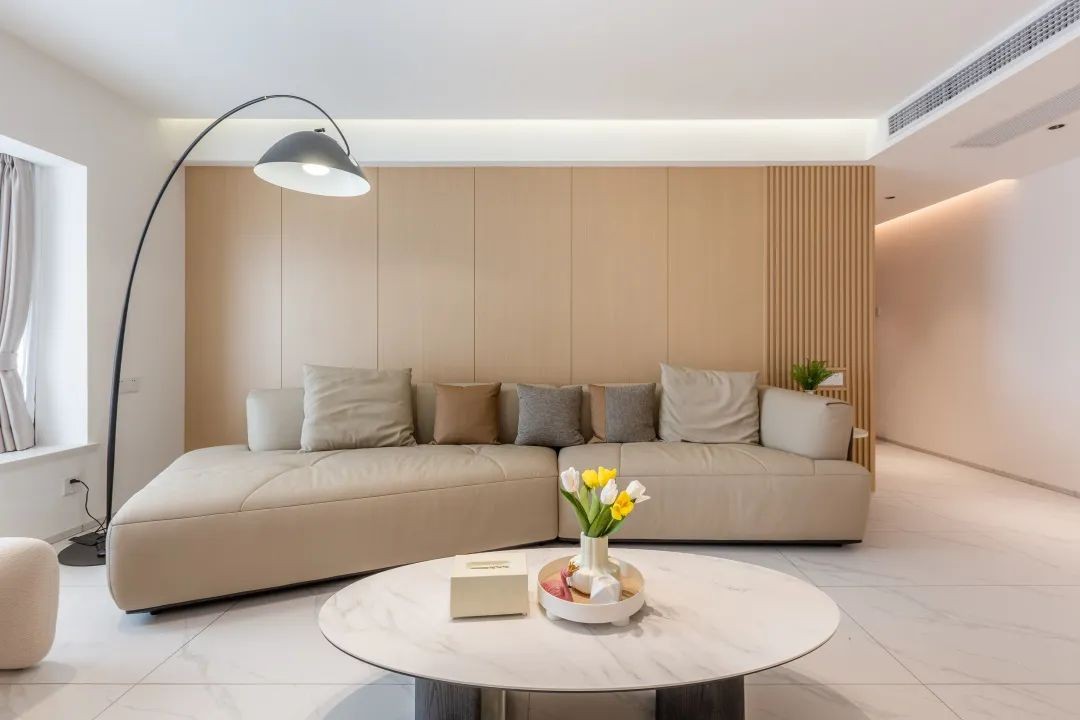 沙发背景墙以木饰面+格栅搭配,沙发颜色与背景墙色彩相近,几乎融为一体,椭圆形大理石纹路的白色茶几,质感十足,空间素雅而温润。