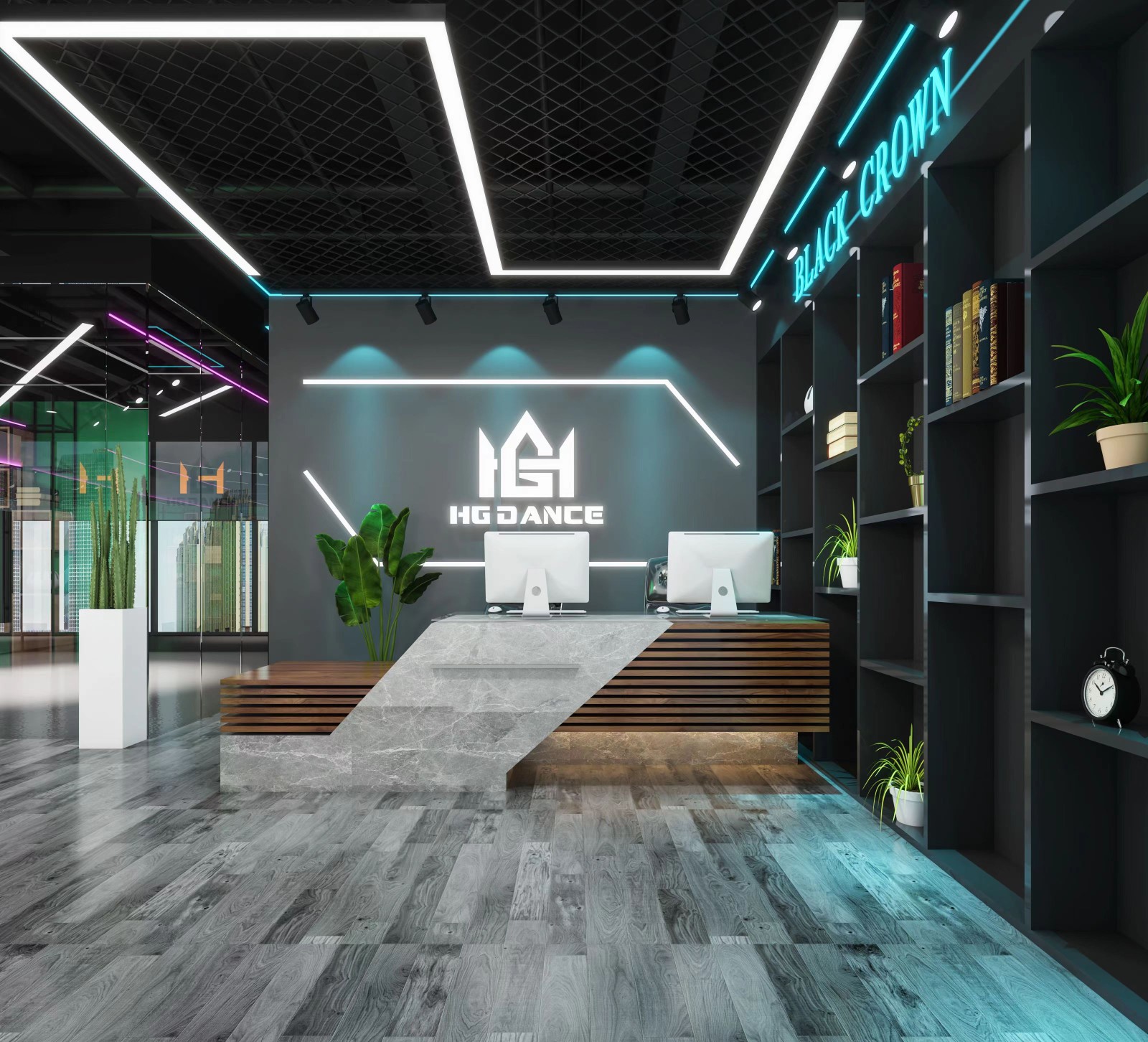 舞蹈室采用镜面玻璃,异形铁艺网、线条灯装饰,用设计栓释城市舞者的混沌、活泼、躁动;