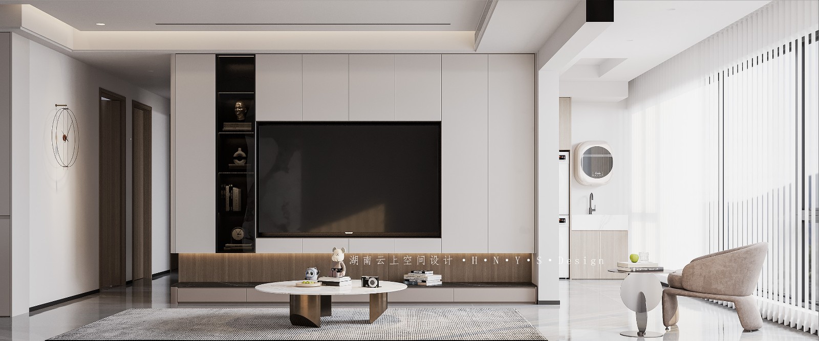 客厅电视背景墙设计。去除装饰主义,采用整面电视收纳柜设计,弥补了客厅区域收纳不足的问题。