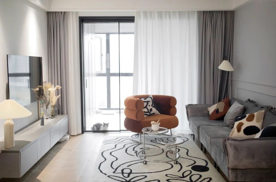 设计师选择用灰白为主调,加棕色点缀,营造一种现代和微复古的融合感,屋主全程参与设计,最终呈现出好看且实用的居家环境。
