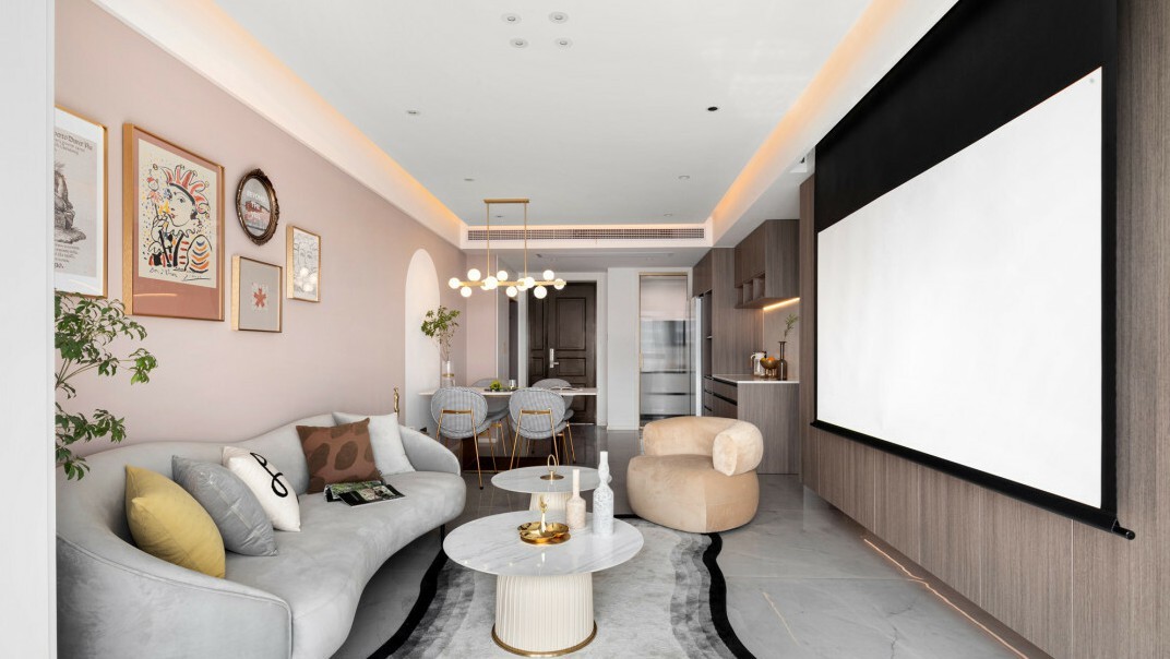 其它空间都是无主灯的设计,唯独在餐桌上留了一盏吊灯,增加浪漫轻奢的氛围感,打到食物上也可以让美食更加诱人。