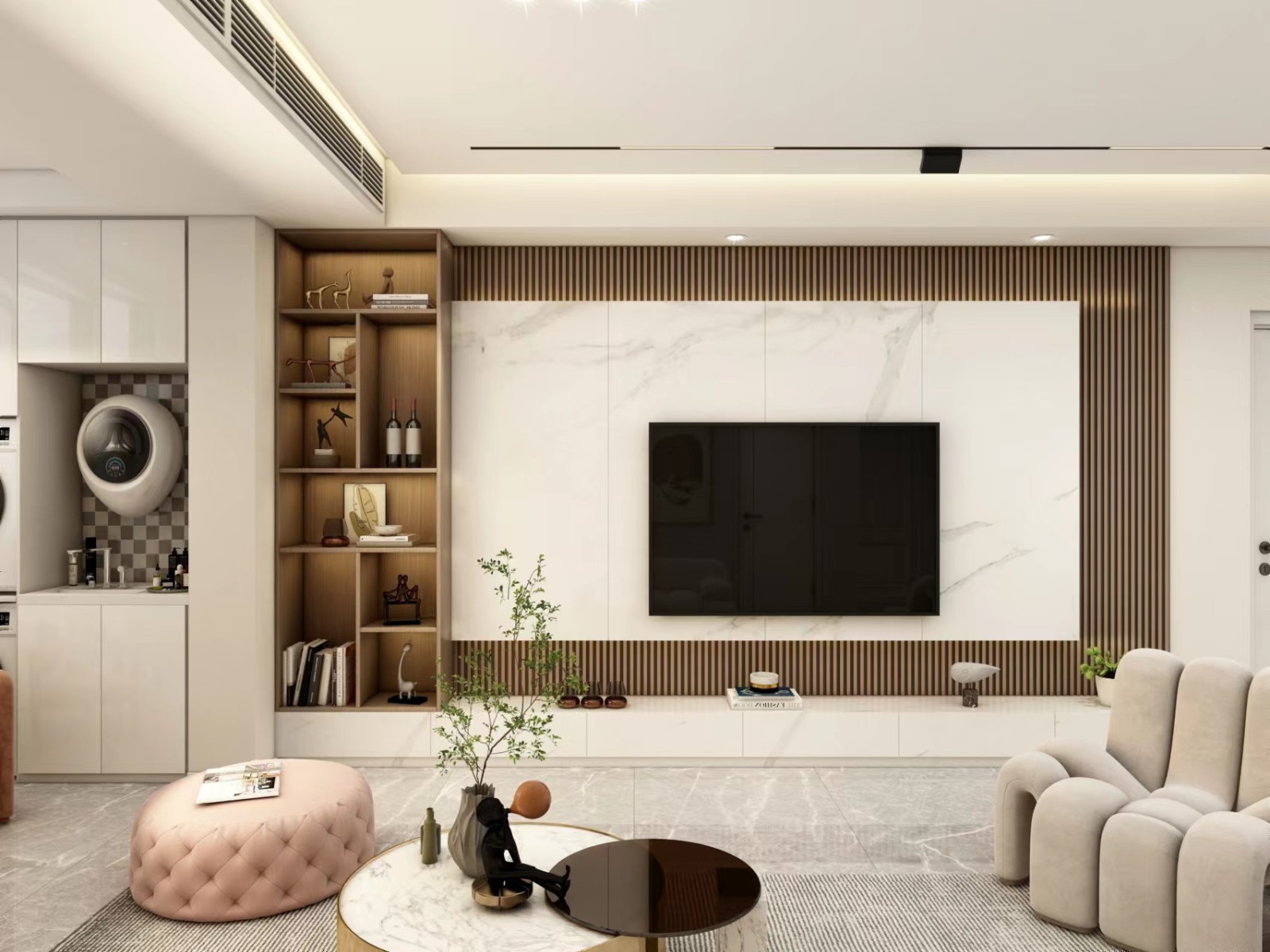 顶面安装的无主灯,如今都比较流行这种款式的设计,颜值很高,照明亮度足够。