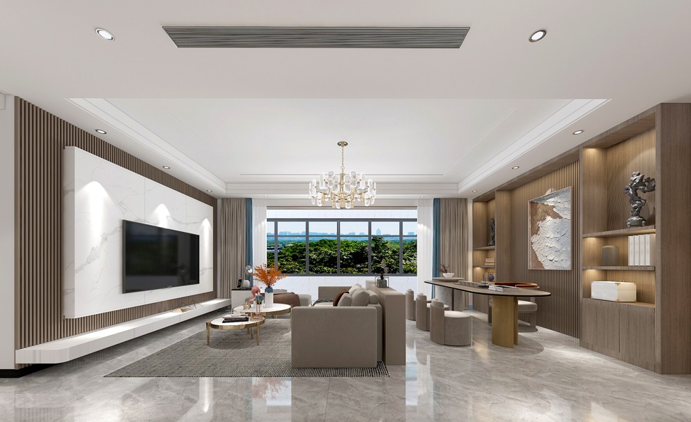 电视墙白色石材花纹岩板材质,造型电视柜和电视墙合理搭配。