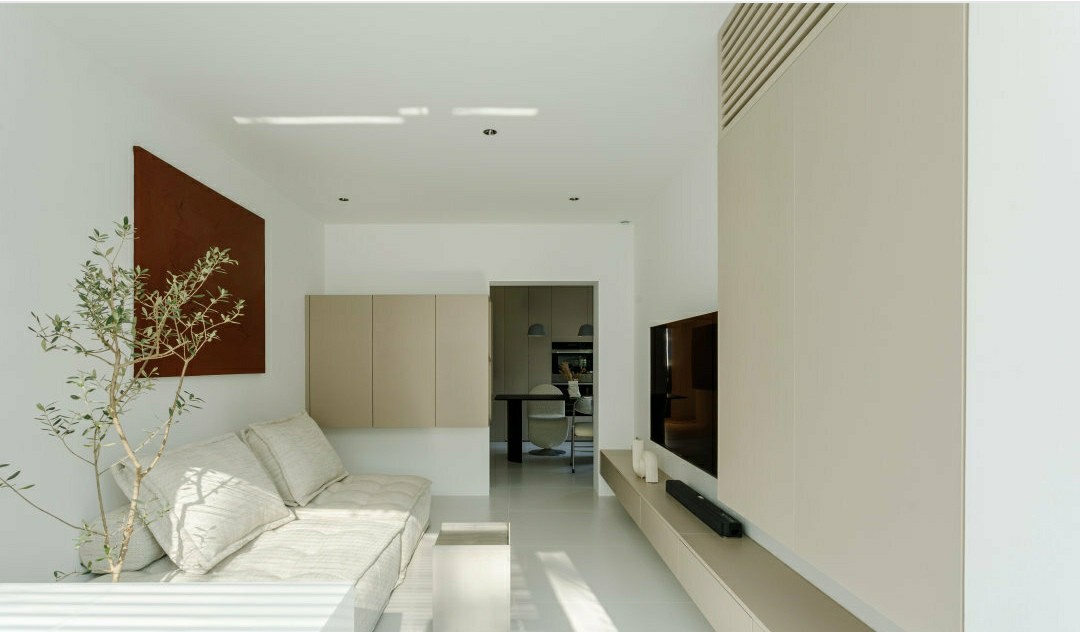 客厅阳台望向餐厅区,电视背景处利用墙面的凹角做了一整面墙的收纳柜体处理,插座也被藏置在了抽屉下方;右手的悬空柜体上部分放置了空调,下部分是用来储放杂物,为了整体美观,在这里特别做了可以打开的百叶柜门,既不影响空调使用效果,也能很好保持柜体连贯。