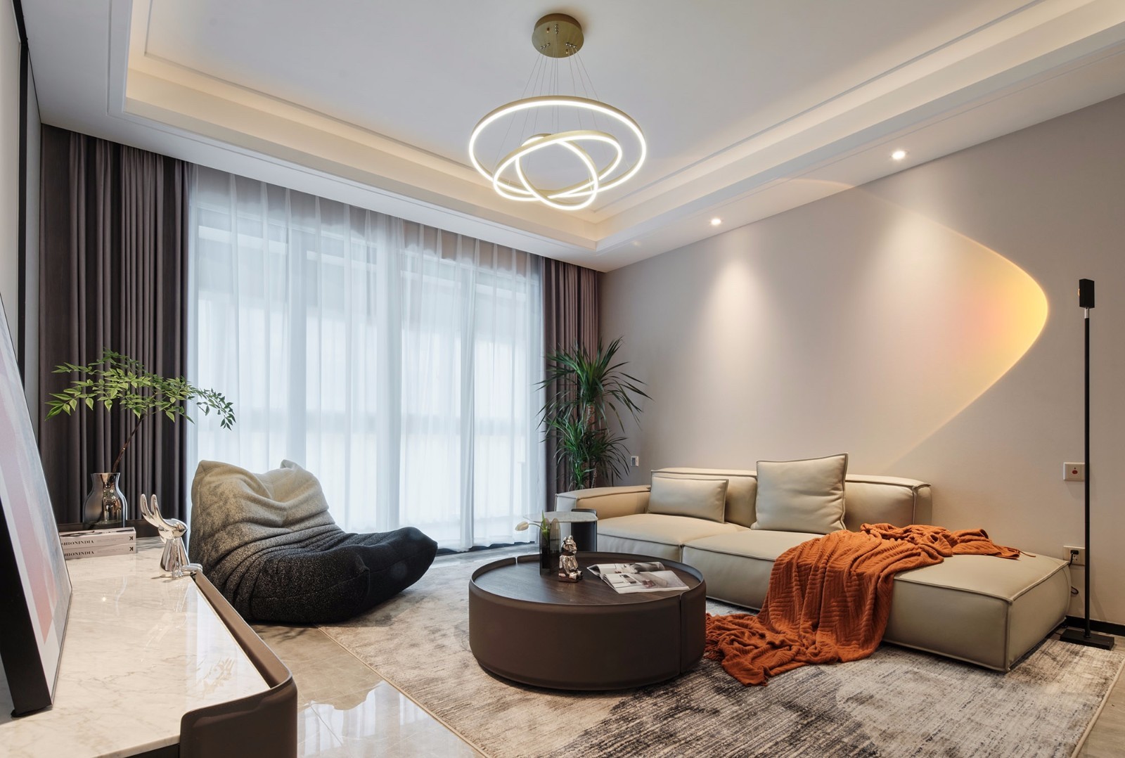 大面积奶茶色铺展于立面,描摹出静谧、安心、温馨的氛围,以直达感官的效果,抹去生活中的压力。富有层次灰,赋予了整体空间统一调性。借用几何图形与精致笔触,尽抒现代美感