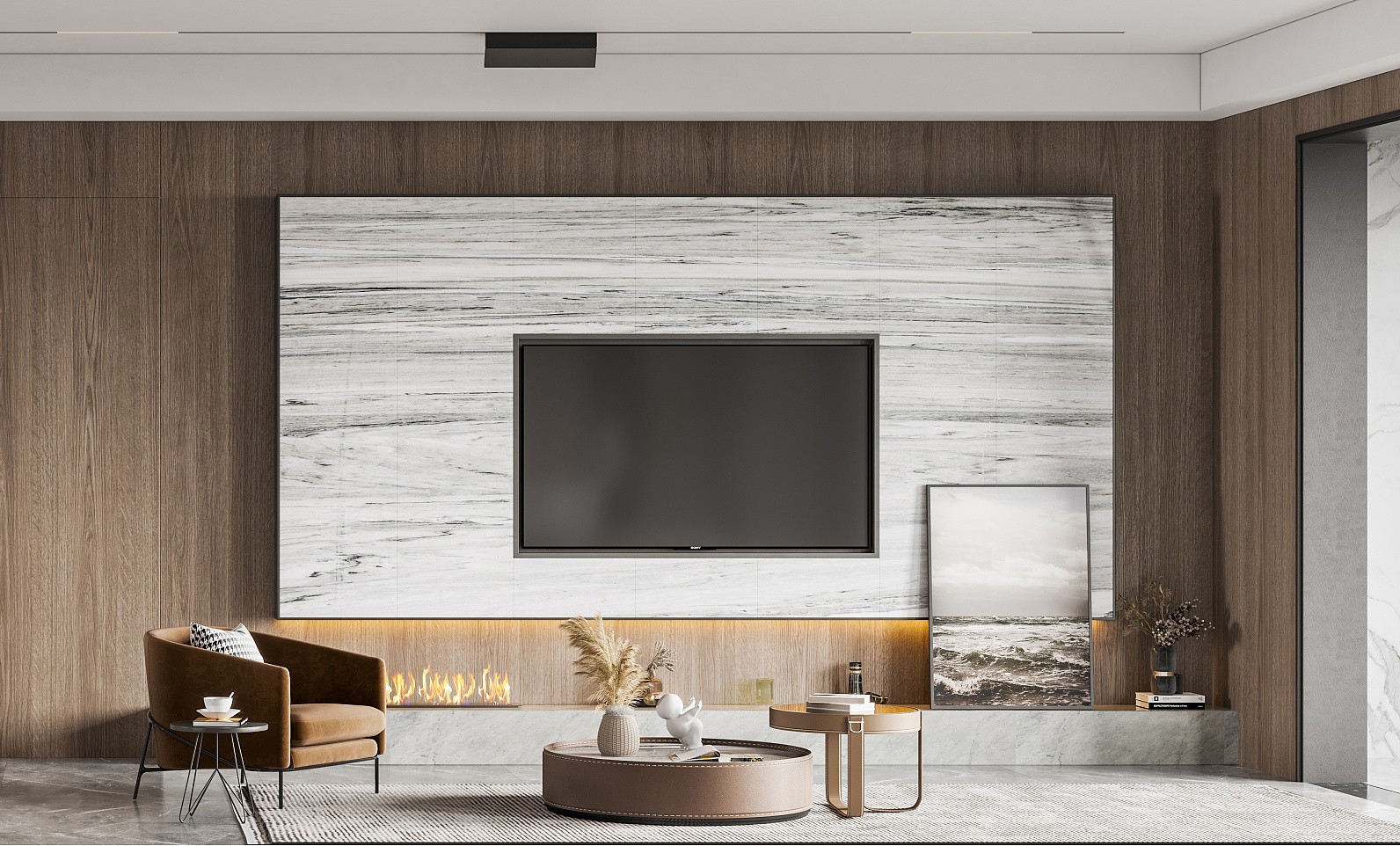 电视墙岩板搭配木饰面及家具陈设,无主灯设计等均以简洁的造型、纯洁的质地、精细的工艺为其特征。