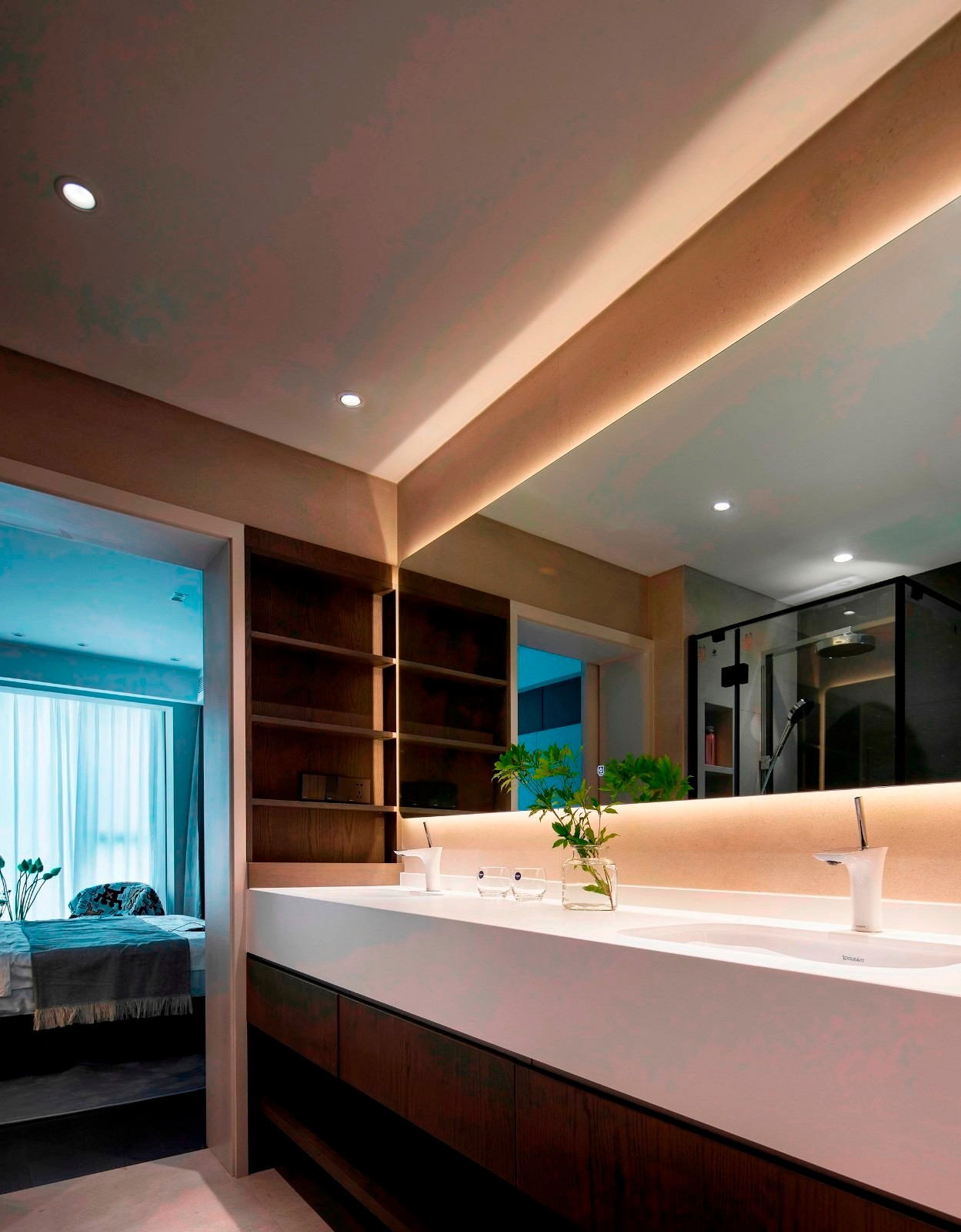 明镜被朦胧光晕包裹,形成虚实相间的视觉层次,放大了卫生间的纵深尺度。光滑平面借用反射特质,缓冲了空间的拘谨感,让明亮感知带来好心情。透明玻璃阻挡了水汽,完美体现干湿分区的科学性。