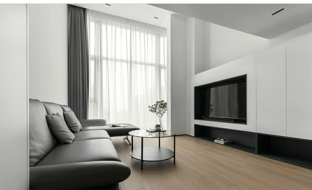 保留原始层高,客厅打造高挑空的舒适空间。我们把阳台打通,并更换大面积落地窗,让光线能够充分进入室内,营造客厅通透明亮的感受。电视墙面利用承重墙体厚度与楼板高度,规划功能型电视背景墙。电视内嵌与柜面平整,底部双开放架,增加部分收纳空间,实用与美观兼顾。