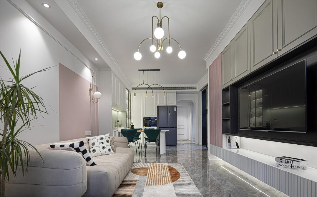客厅地面使用800*800灰色地砖,沙发墙设计拼色,白色+粉色墙面漆,同时石膏线也随之墙面拼色所变化,米色系的香蕉船沙发,因为客餐厅是南北贯穿式的,客厅与餐厅中间不采取任何地面上或者立面上隔断造型。 电视墙设计整面的收纳柜,其中两扇波浪板柜门采用粉色,与沙发墙相呼应。