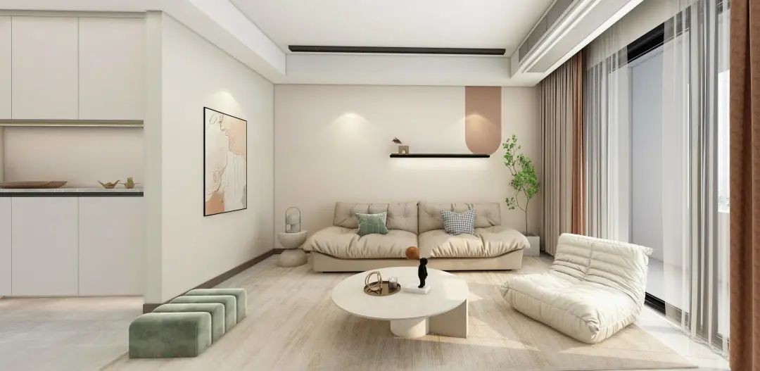 客厅大面积使用奶油色乳胶漆装饰,做了局部色块拼贴,增加趣味