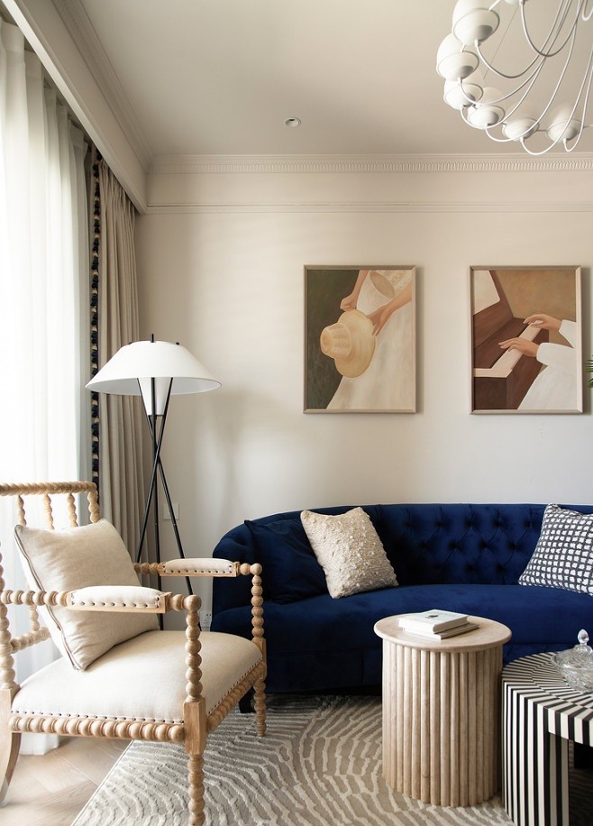 屋主喜欢的青花瓷蓝调元素,我们设计在私密的主卧空间,软装布置与公区一致,淡雅的法式风,构造舒适清爽的睡眠空间。