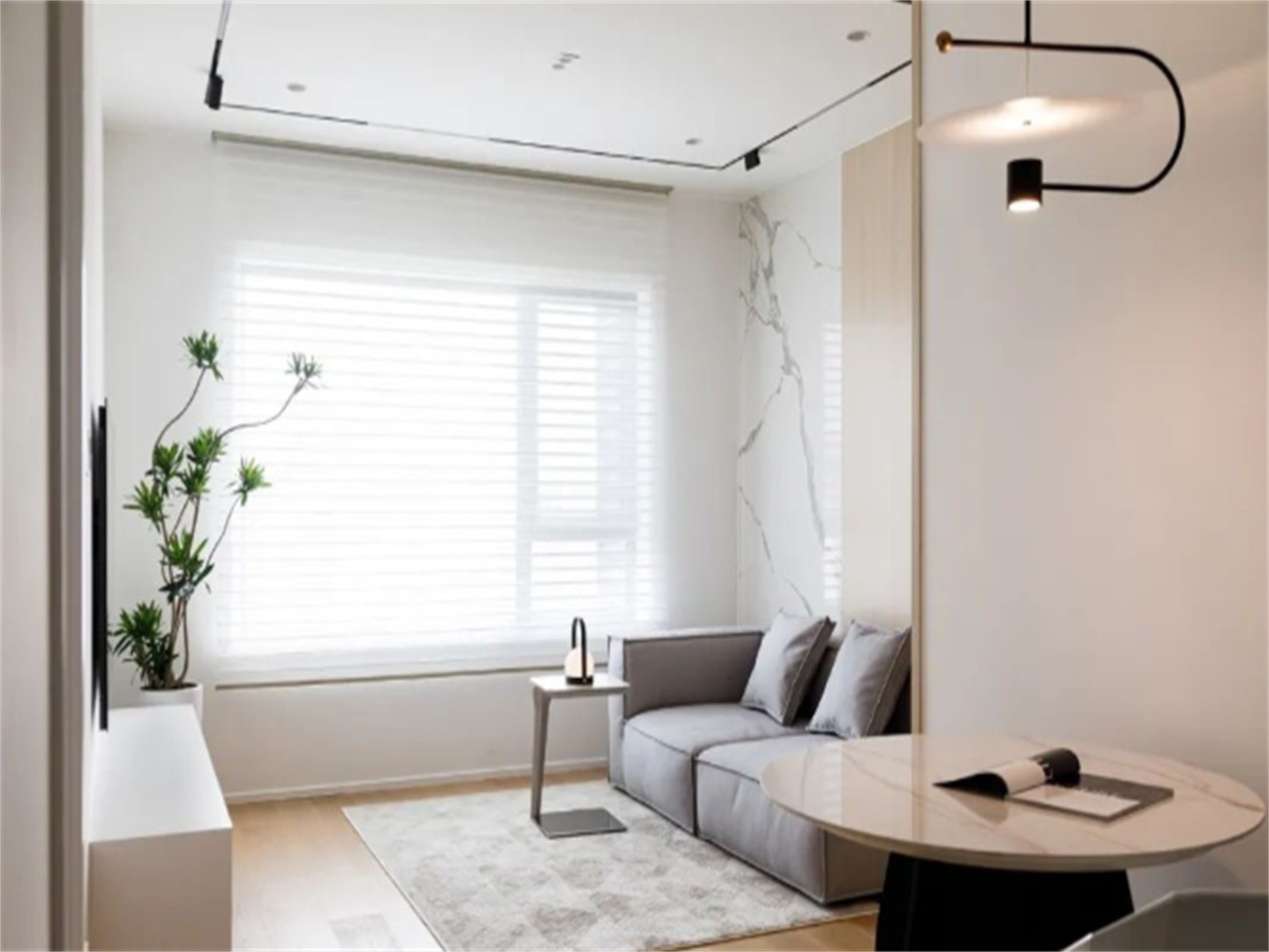 客厅,以大面积的木色+白色为基调,百叶柔纱帘是电动的,平时可以用遥控器来开合、调节叶片角度,非常方便
