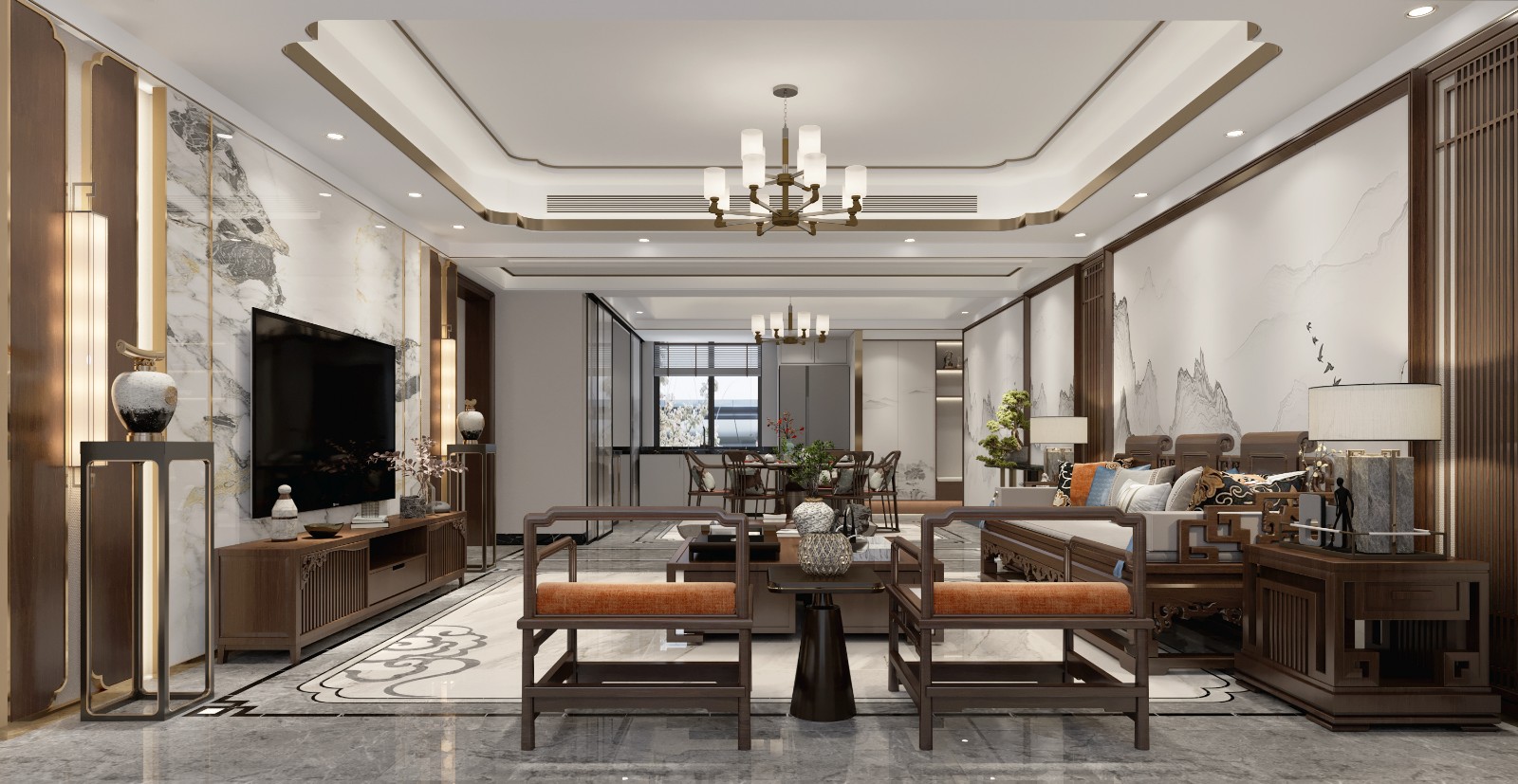深木色搭配方正的家具造型,将客厅装点得大气高雅,中式韵味十足,硬装部分则以白色为主,大理石材质搭配祥云图案,又添几分灵动飘逸的感觉。