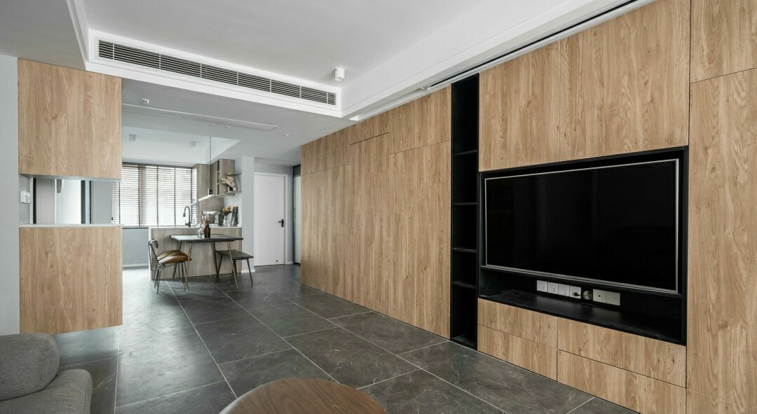 客厅餐厅空间最终选择用瓷砖来作为地面主要材质,因为地砖的导热性会更好一点,然后地砖的纹理也会更丰富!电视柜因为主要是以储物为主,所以只留空了放电视位置和一排展示柜。