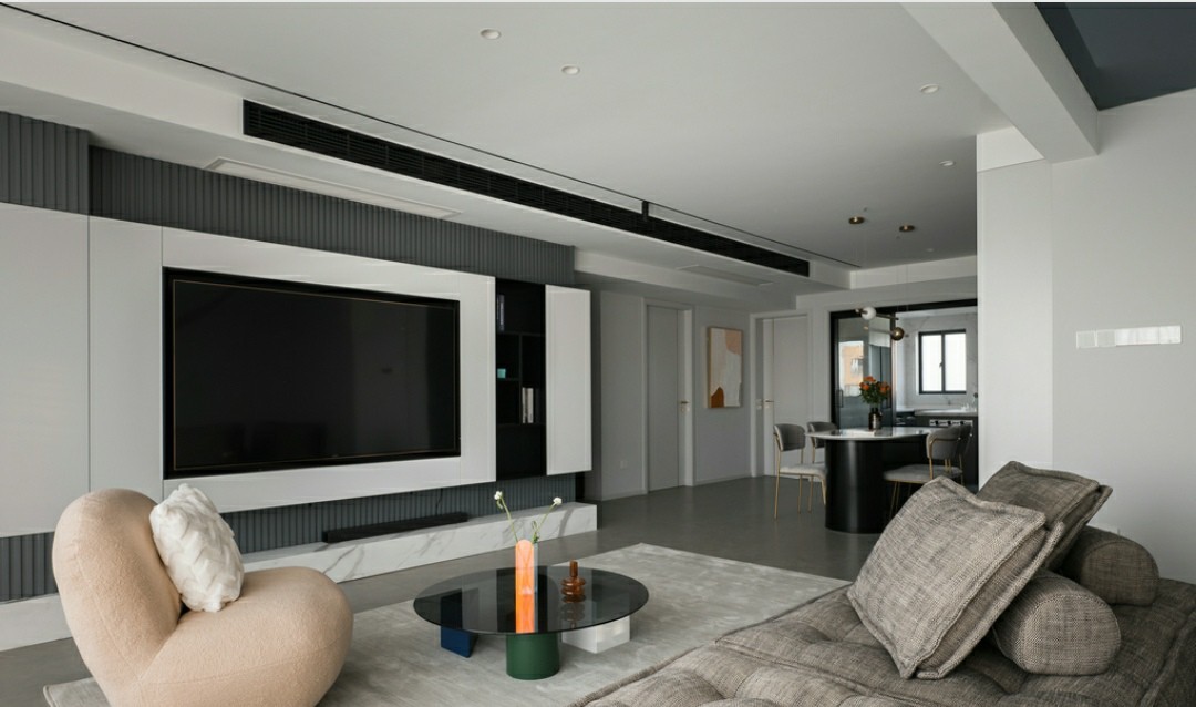 以简约舒适的现代格调,灰色木格栅与黑白的色彩搭配的电视背景墙,给人纯净的宁静质感,